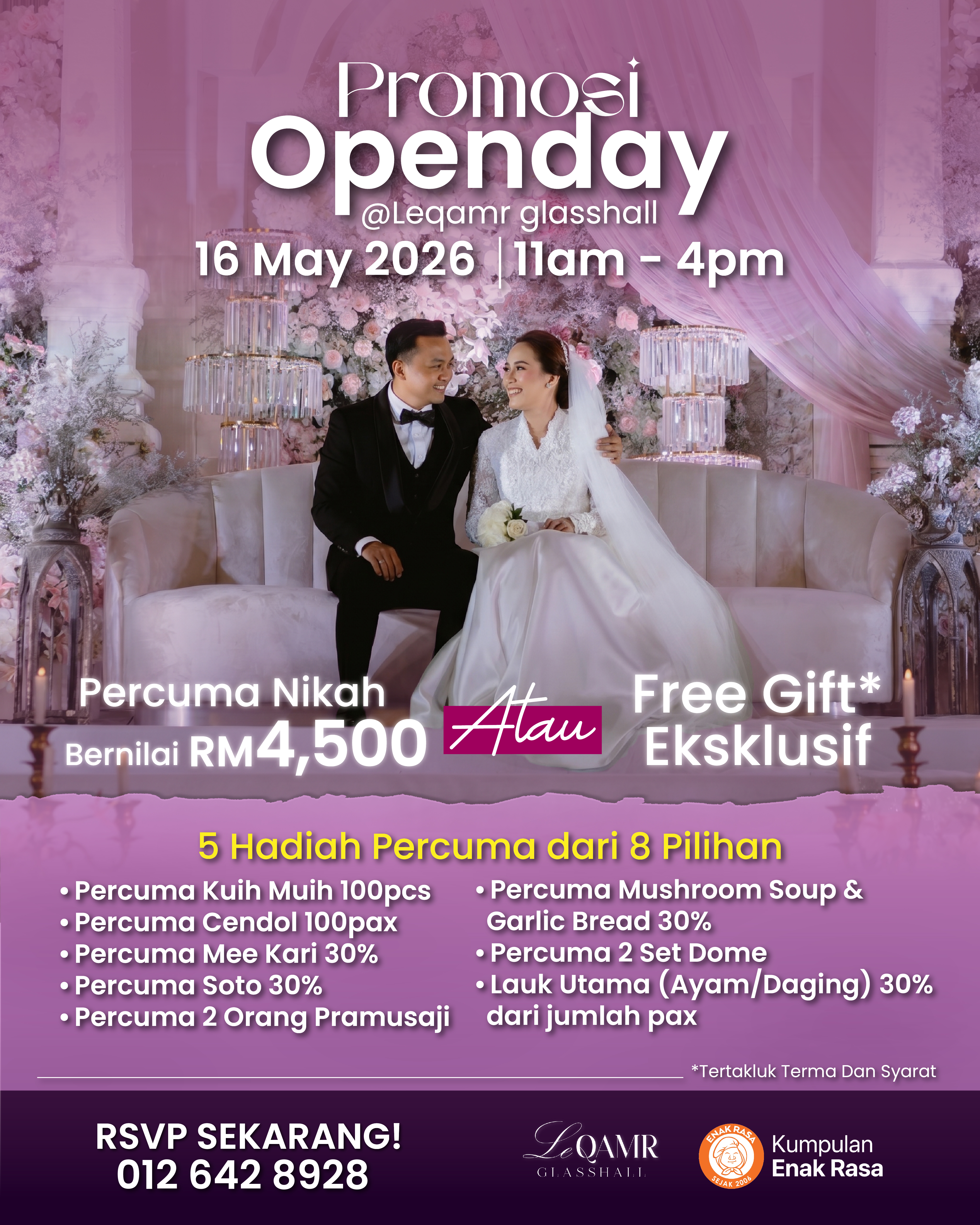 Raikan cinta abadi anda tanpa sebarang kerumitan. Pakej perkahwinan lengkap Kumpulan Enak Rasa menawarkan dekorasi memukau, katering lazat, dan perancangan teliti untuk merealisasikan majlis impian anda di Tiga Lokasi Dewan Villa Istana Melaka, Le Qamr Glasshall dan Sutera Hall.